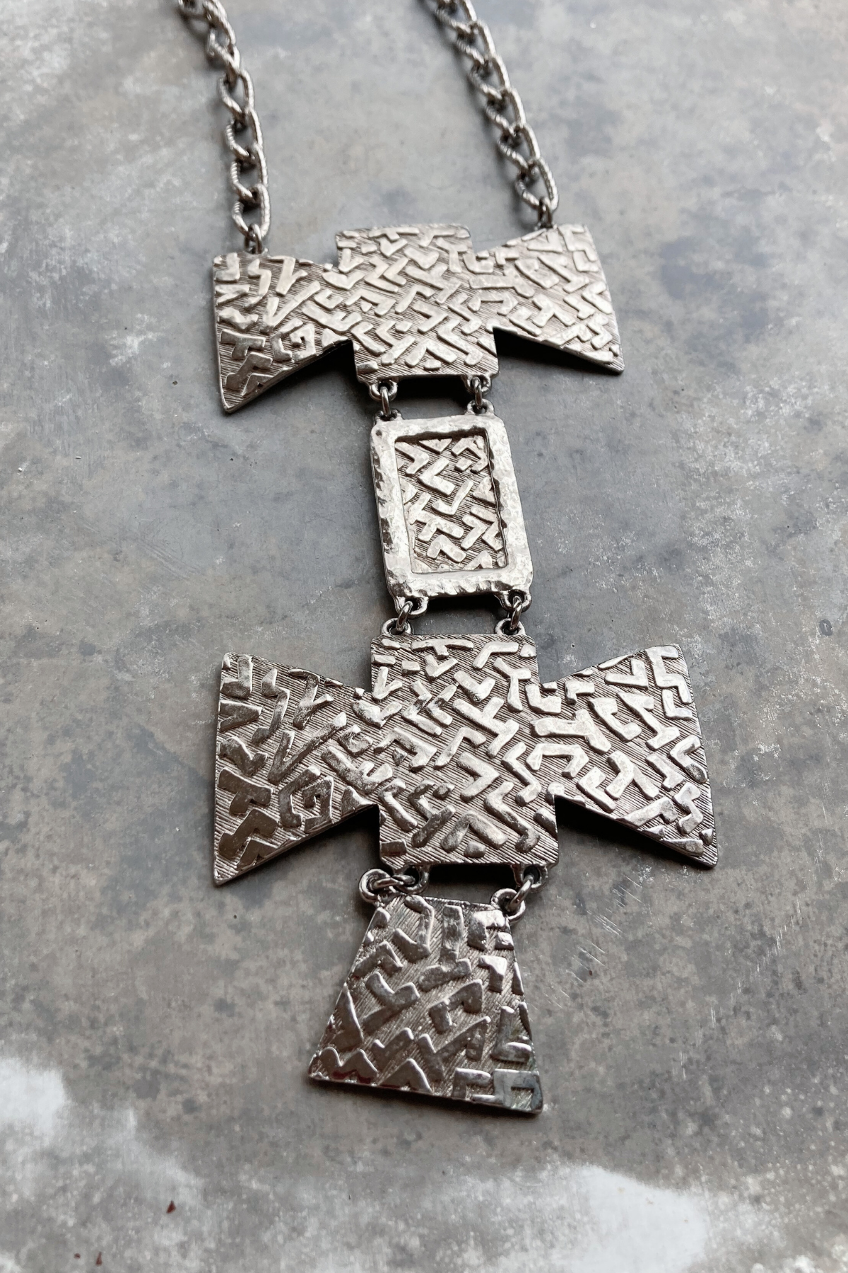 Impress onlookers with this on-point boho themed silver necklace. Its unique aztec design will add a stylish touch to any ensemble.